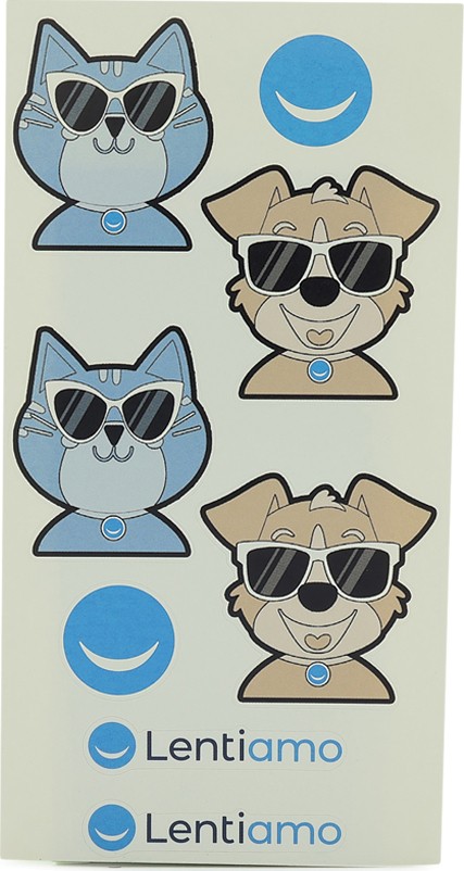 Iepakojumā ir jautra krāsojamā kaste ar kaķu un suņu uzlīmju komplektu.