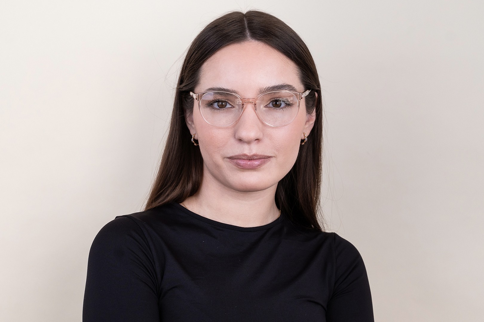 - Оранжевый цвет оправы идеально сочетается с теплым тоном кожи и черными, темно-каштановыми и темно-русыми волосами.